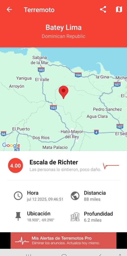 Batey Lima, República Dominicana. – Un temblor de tierra de magnitud 4.0 en la escala de Richter se registró este sábado 12 de julio de 2025, a las 9:46 de la mañana, con epicentro en la zona de Batey Lima, en la provincia de Hato Mayor.